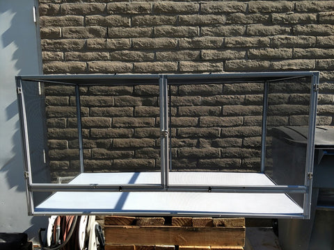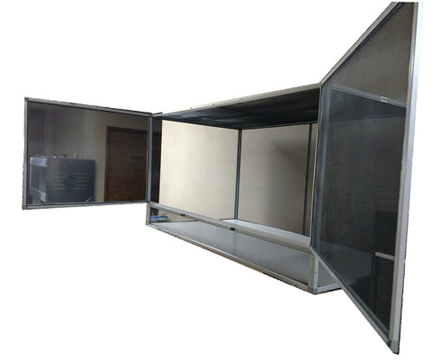 This enclosure is all heavy gage aluminum screen and frame with a pvc bottom. 2 Doors open outward with LATCHES ON TOP, BOTTOM, AND MIDDLE to prevent escaped bugs!